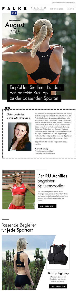 Das Design hat Magazincharakter, mit großem Aufmacher und einem personalisierten Editorial. FALKE lässt hier seine Vertriebsleiter zu Wort kommen, die die Themen des Newsletters kurz und knapp zusammenfassen sowie Nähe und Erreichbarkeit herstellen. Relevanz und Nutzen für den Händler sind hier klar erkennbar, der Abverkauf steht weniger im Vordergrund.